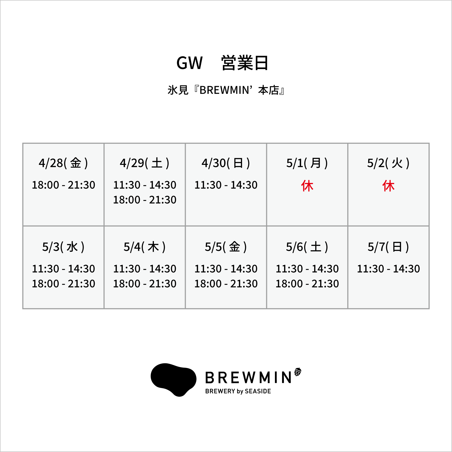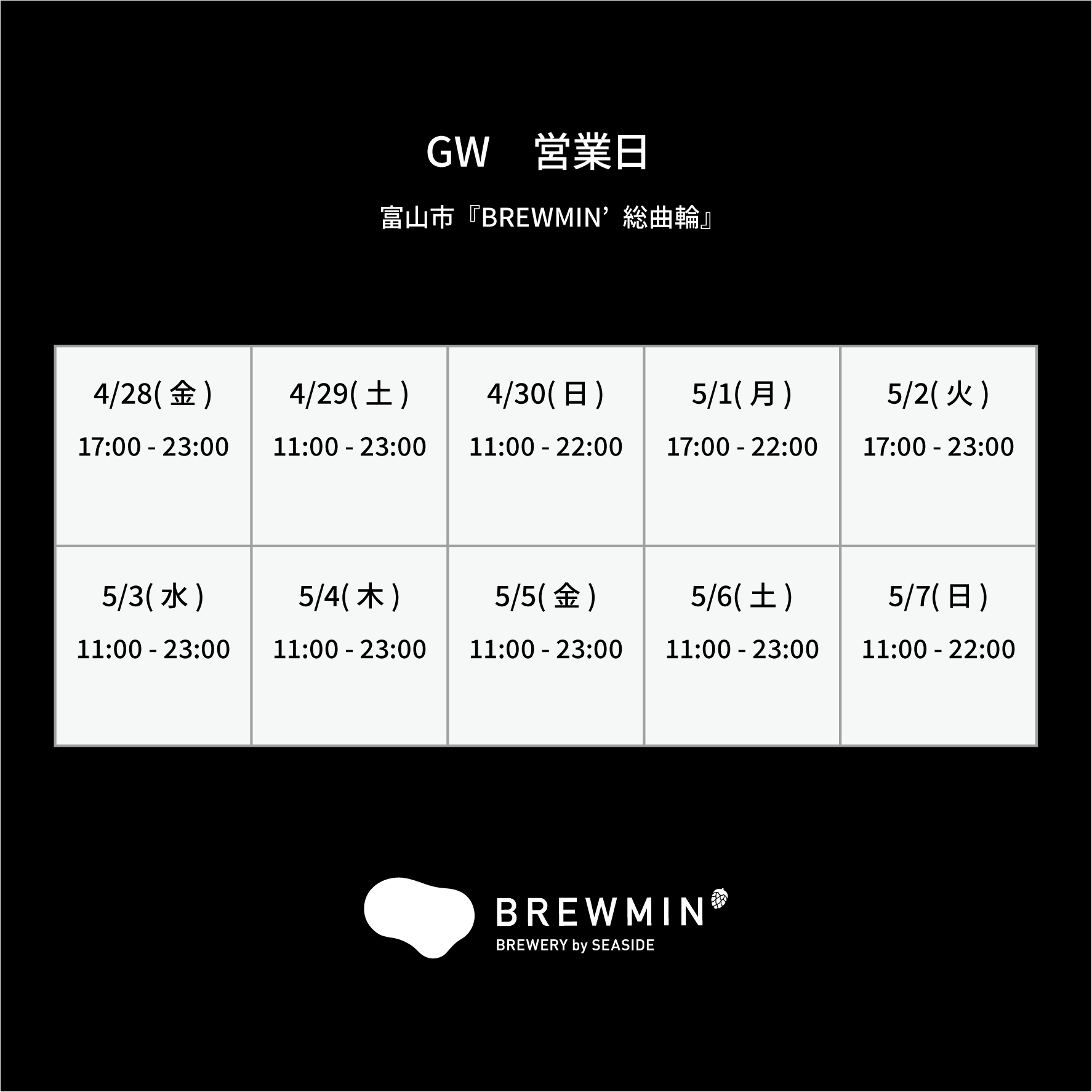 2023.04.29 >>GWの営業カレンダー 氷見市「BREWMIN’本店」 3日・4日はワンミートフェスに出店します。(出店に伴い、氷見市のBREWMIN’本店はお食事メニューを一部縮小して営業します) 富山市「BREWMIN’総曲輪」 >>4月の営業カレンダー 前の記事 ≫≫5月の営業カレンダー 次の記事