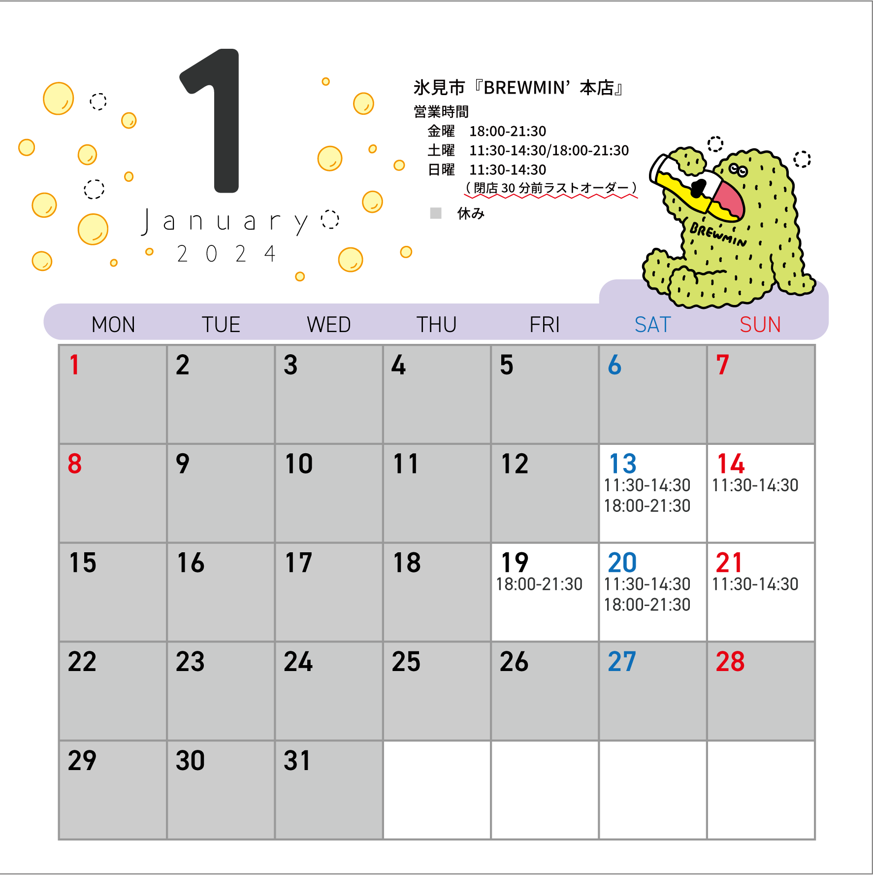 2024.01.7 >>1月の営業カレンダー BREWMIN’本店(氷見市) 地震による被害は店舗・工場ともに致命的な損害はありませんでした。13日より営業を再開します。26日~28日はお休みです。 BREWMIN’総曲輪(富山市) 毎週水曜日の定休日に加えて、9日、16日がお休みです >>年末年始の営業カレンダー 前の記事 >>2月の営業カレンダー 次の記事