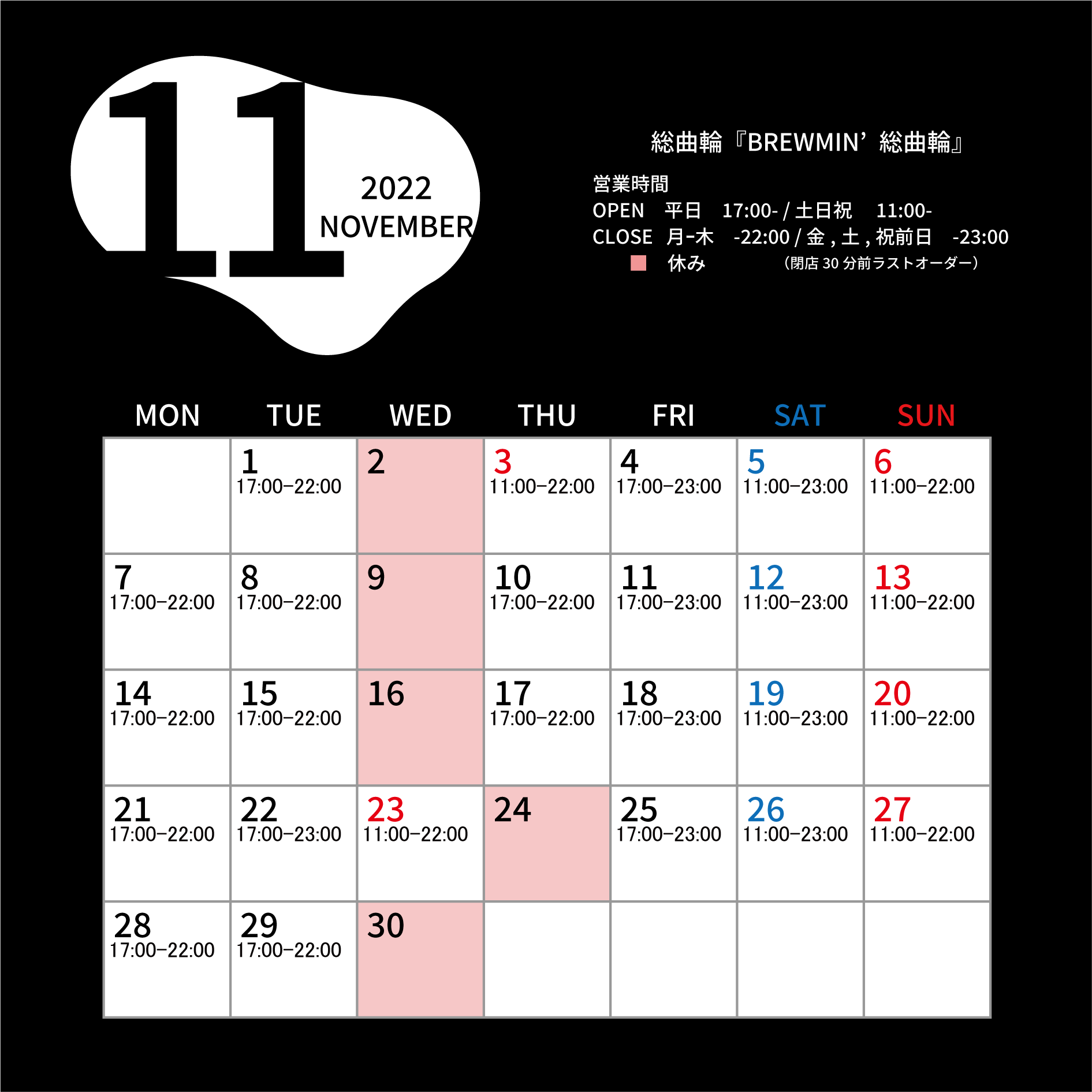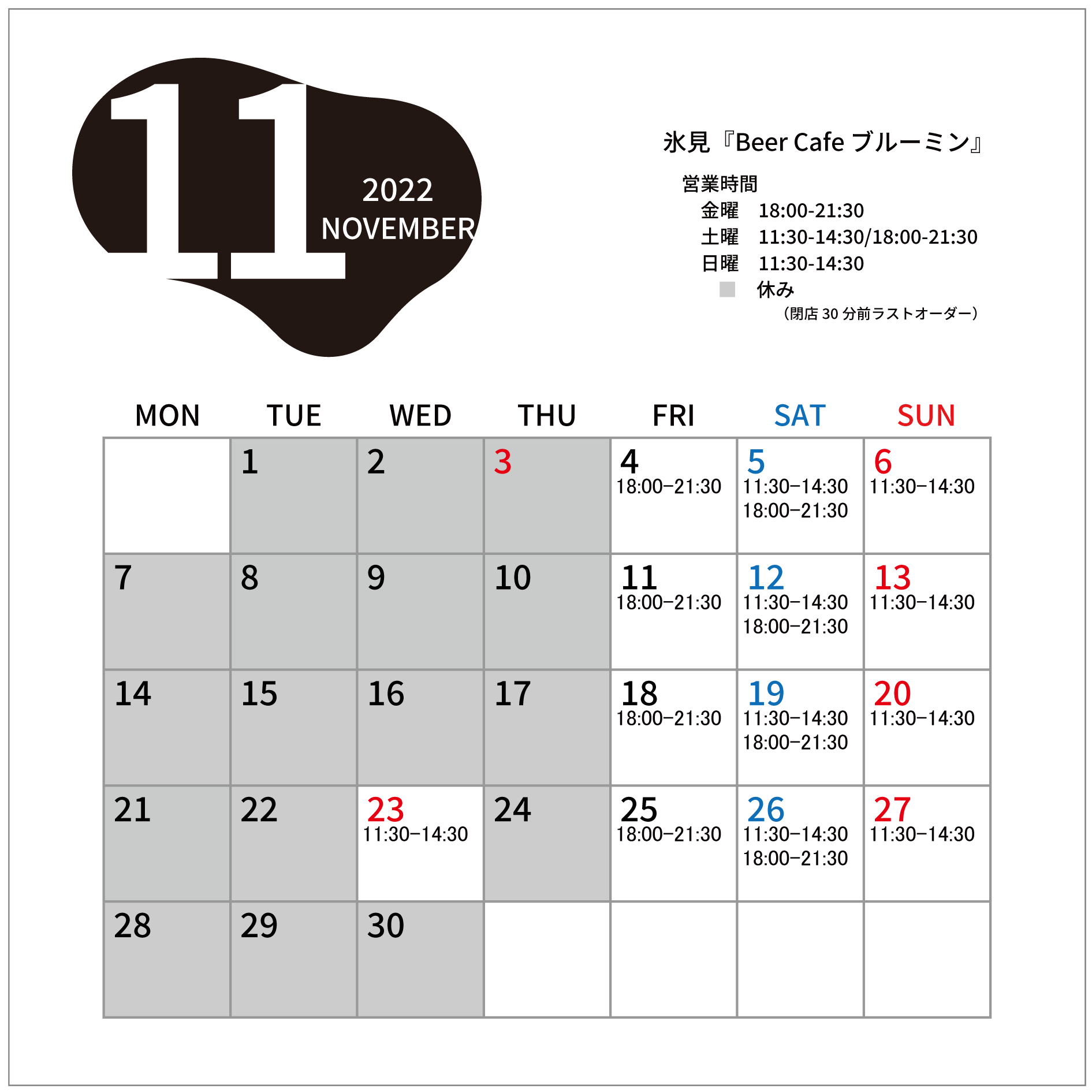 3日・23日は祝日のため、昼から夜の通し営業です。